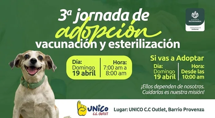 La Administración Municipal invita a toda la ciudadanía a participar en la tercera jornada de adopción, vacunación y esterilización de perros y gatos, que se realizará el próximo domingo 19 de abrir a que se vinculen a una gran jornada de adopción, esterilización y vacunación que se llevará a cabo a partir de las 7:00 de la mañana en el Centro Comercial UNICO Outlet. A las 7:00 de la mañana daremos inicio a la esterilización y vacunación, y a partir de las 10:00 de la mañana tendremos la gran jornada de adopción. Los esperamos a todos.”