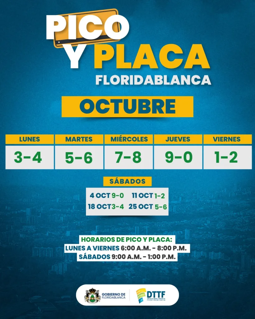 La Dirección de Tránsito y Transporte de Floridablanca, DTTF, informa a la ciudadanía que, desde este miércoles, 1 de octubre, se reinicia la medida del Pico y Placa, la cual se implementó mediante la Resolución 601 del 25 de septiembre de 2025.