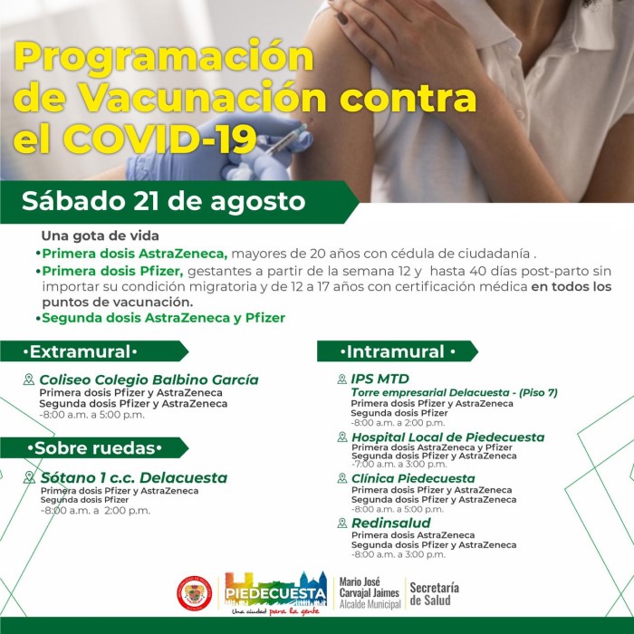 Atentos a los puntos de vacunación y las vacunas disponibles contra el COVID-19 para hoy sábado 21 de agosto.