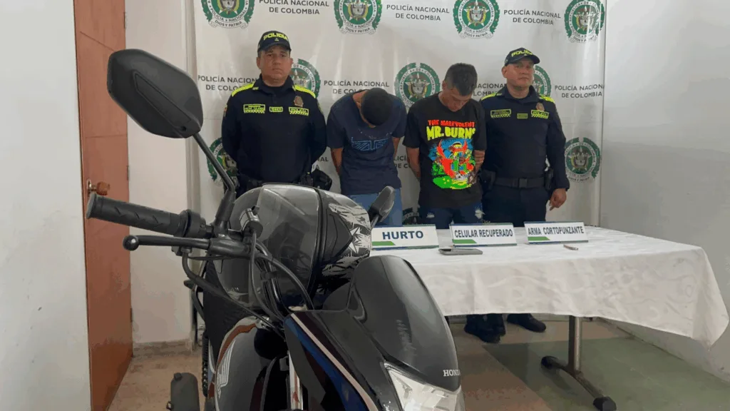En una rápida acción operativa desarrollada por la Policía Metropolitana de Bucaramanga, fueron capturados dos hombres señalados de hurtar a una mujer en el barrio Nueva Granada, al norte de la ciudad. Los sujetos, identificados por las autoridades como “William” (34 años) y “Juan Sebastián” (24 años), fueron sorprendidos por una patrulla cuando intentaban huir en motocicleta tras cometer el ilícito.