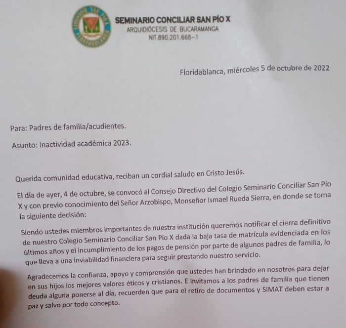 En el oficio que cada padre de familia o acudiente recibió, las autoridades del seminario dejan claro que el citado colegio culminará su actividad académica este año (2022) y que para el 2023 ya no estará operativo.