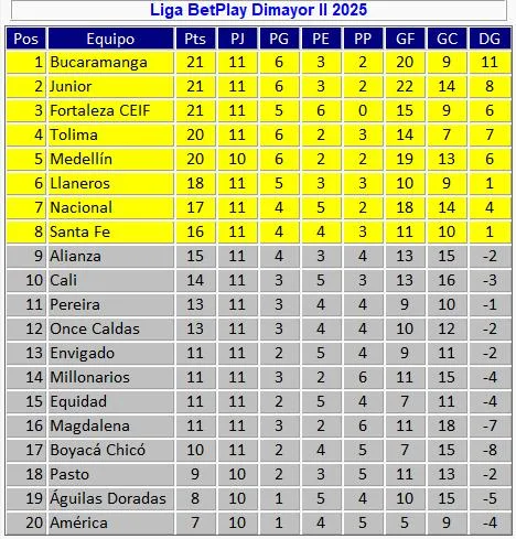 En el cuarto y quinto lugar se ubican Tolima y Medellín, con 20 puntos cada uno, mientras que Llaneros con 18, Nacional con 17 y Santa Fe con 16, completan los 8 primeros equipos del fútbol colombiano por su rendimiento.