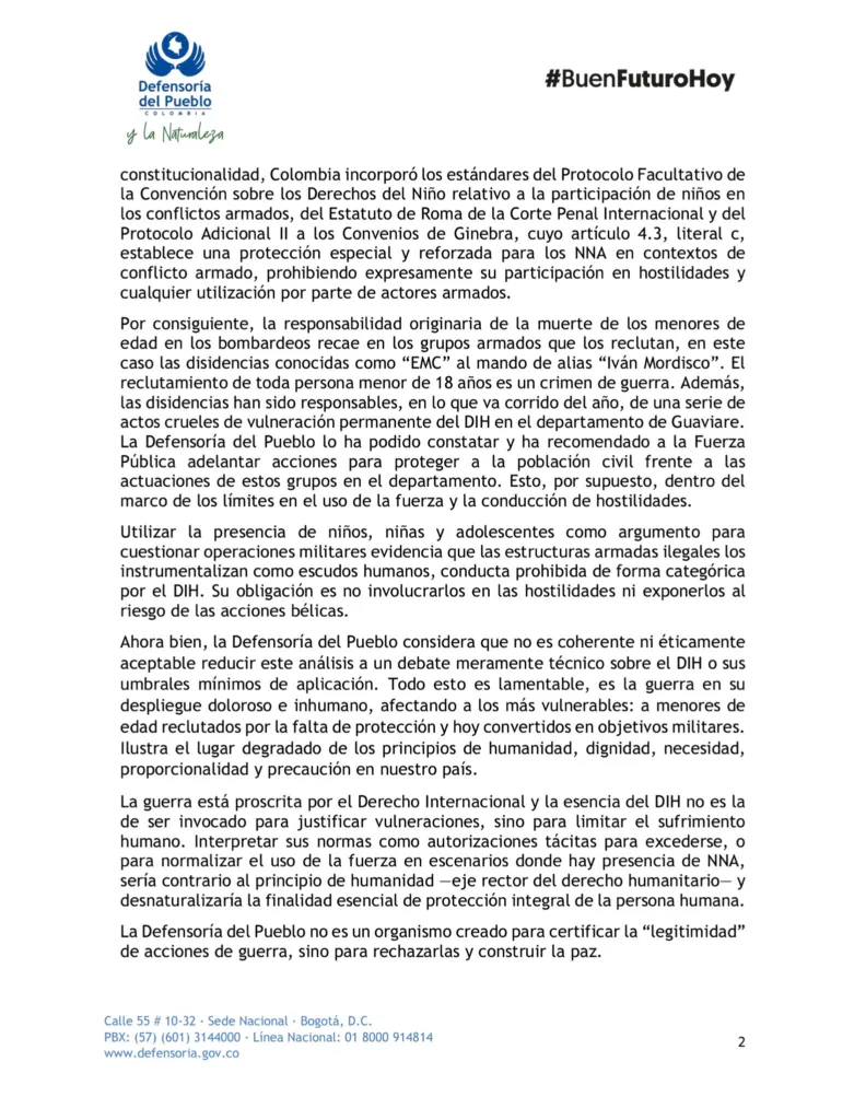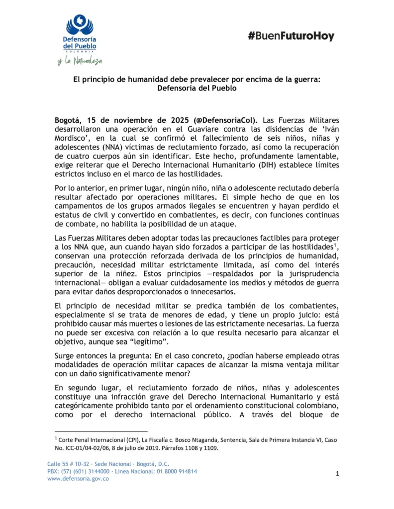 En un comunicado, la Defensoría recordó que el Derecho Internacional Humanitario (DIH) establece límites estrictos incluso en medio del conflicto armado.