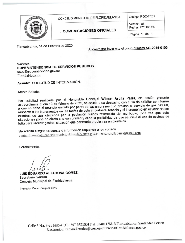 El Concejo Municipal de Floridablanca, a solicitud expresa del concejal, Wilson Ardila Parra, solicitó a la Superintendencia de Servicios Públicos que fije posición acerca del elevado incremento en las tarifas del gas domiciliario en el municipio.