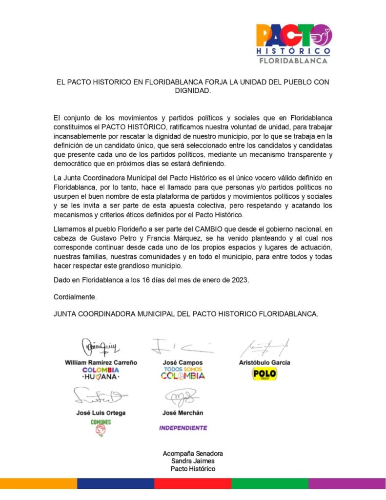 En el comunicado también aparece el nombre de la senadora Sandra Jaimes, quien suscribe y rubrica lo expuesto, convocando a la unidad y recordando que solo de forma colectiva se puede lograr el cambio que tanto han esperado y esperan los sectores progresistas de Floridablanca.