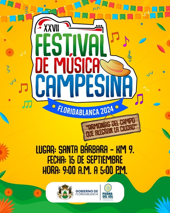 El próximo domingo, 15 de septiembre, a partir de las 9 de la mañana, en el sector Santa Bárbara, km 9 vía a Cúcuta, se cumplirá la catorceava jornada del XXVII Festival de Música Campesina Floridablanca 2024.