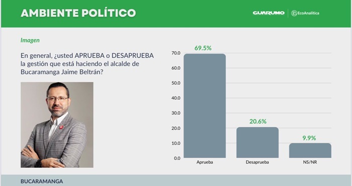 En el otro extremo se halla el alcalde de Bucaramanga, Jaime Andrés Beltrán, quien venía descendiendo, aunque levemente y en la medición de febrero alcanza el 69,5%, una alta favorabilidad, muy similar a cuando llegó a la alcaldía el año pasado. Según Guarumo, Beltrán se recupera y sus acciones suben.