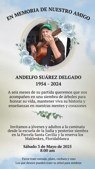 Quienes formaron parte, junto a Andelfo Suárez del Comité para la defensa de los Cerros Orientales de Floridablanca, se sumarán a este tributo al hombre que, contra todos los obstáculos, defendió el hábitat conformado por los cerros que le regalan a Floridablanca agua, aire, paisaje y vida.