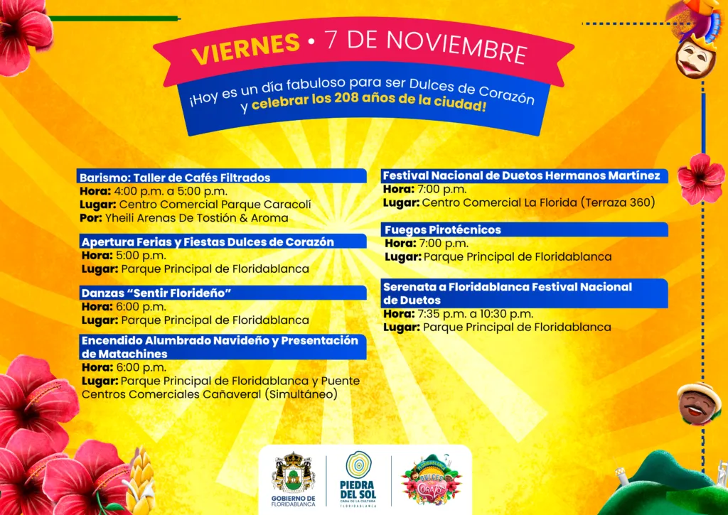 Este viernes 7 de noviembre, Floridablanca empieza a celebra sus 208 años de historia con una agenda cargada de actividades culturales, gastronómicas y artísticas que marcan el inicio oficial de las Ferias y Fiestas Dulces de Corazón 2025.