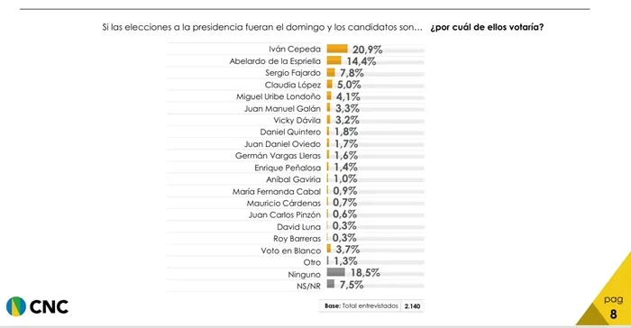 Procesados los resultados, Iván Cepeda lidera la intención de voto en Colombia con el 20,9%, seguido de Abelardo de la Espriella con el 14,4%; Sergio Fajardo (7,8%), Claudia López (5,0%) y Miguel Uribe Londoño con el 4,1%. Juan Manuel Galán y Vicky Dávila siguen con el 3,2% y de allí para abajo los aspirantes no alcanzan a superar el 2%.