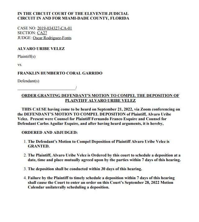 De acuerdo a publicación digital realizada por la reconocida revista Bandalos, el Juez Oscar Rodríguez-Fonts del Circuito 11 del Condado de Miami-Dale de La Florida, una vez más, cita al expresidente colombiano Álvaro Uribe Vélez, para que responda cuestionario de treinta preguntas.