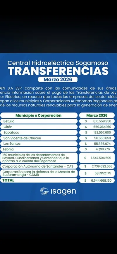 En marzo pasado las transferencias de ley de ISAGEN a los municipios aledaños al embalse de Topocoro alcanzaron los $6.644 millones. Los más beneficiados son Betulia, Girón y Zapatoca. Al menos un 50% de estos recursos deberán ser utilizados en proyectos de agua potable, saneamiento básico y mejoramiento ambiental, algo que no está sucediendo. Según informó Isagen, estos fueron los giros realizados: Betulia ($816’559.950), Girón ($659’064.160), Zapatoca ($182.557.600), San Vicente ($56.650.653), Los Santos ($55.886.674), Lebrija ($4.779.776), además de $1.547 millones a 150 municipios de Boyacá, Cundinamarca y Santander, así como $2.740 millones para Corporación Autónoma de Santander (CAS) y $582 millones para la Corporación de Defensa de la Meseta de Bucaramanga (CDMB).