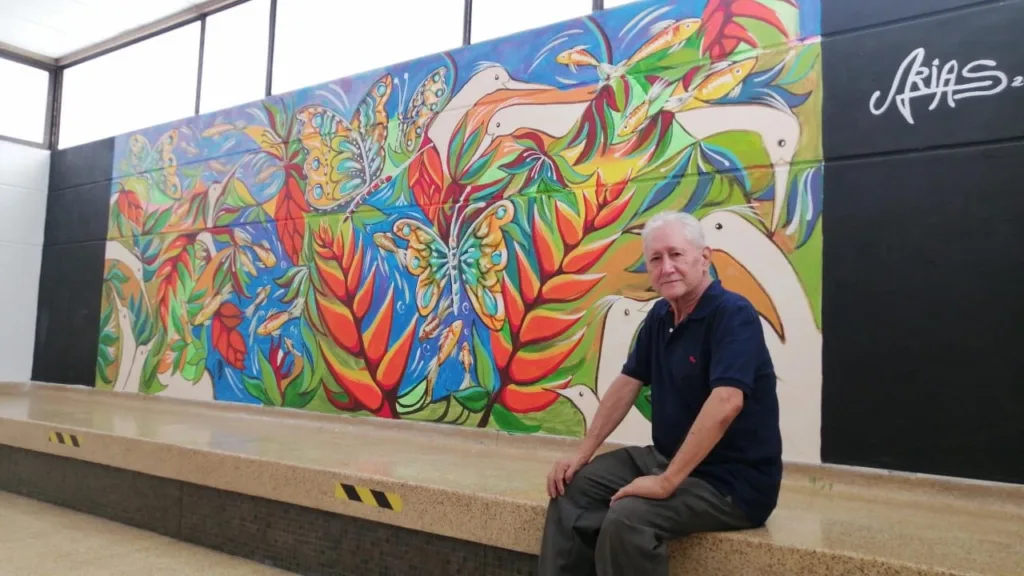 Aquí junto a su obra en el Concejo de Floridablanca “El valle de las garzas y las mariposas”. Foto: Darlin R.