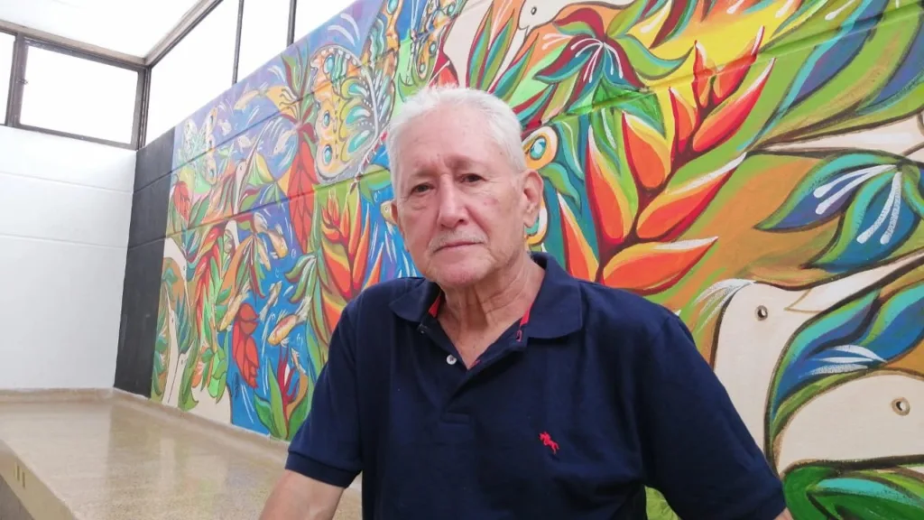 Aquí junto a su obra en el Concejo de Floridablanca “El valle de las garzas y las mariposas”. Foto: Darlin R.
