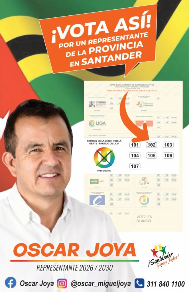 Con un discurso centrado en la defensa de las provincias y en la necesidad de fortalecer la representación territorial, Óscar Miguel Joya Arenales consolida su aspiración a la Cámara de Representantes por Santander, está avalado por el Partido de la U, con el número 102 en el tarjetón.
