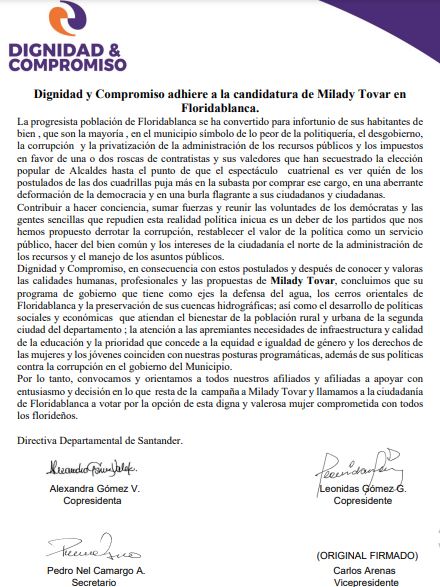 En un importante respaldo político, el partido Dignidad y Compromiso, fundado por líderes políticos como Jorge Enrique Robledo (exsenador de la República) y Leonidas Gómez (diputado de Santander y exsenador de la República), entre otros, ha anunciado su decidido apoyo a Milady Tovar en su candidatura a la alcaldía de Floridablanca.
