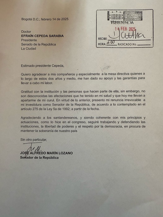En las últimas horas, el santandereano José Alfredo Marín Lozano presentó su renuncia irrevocable ante el presidente del Senado, Efraín Cepeda.