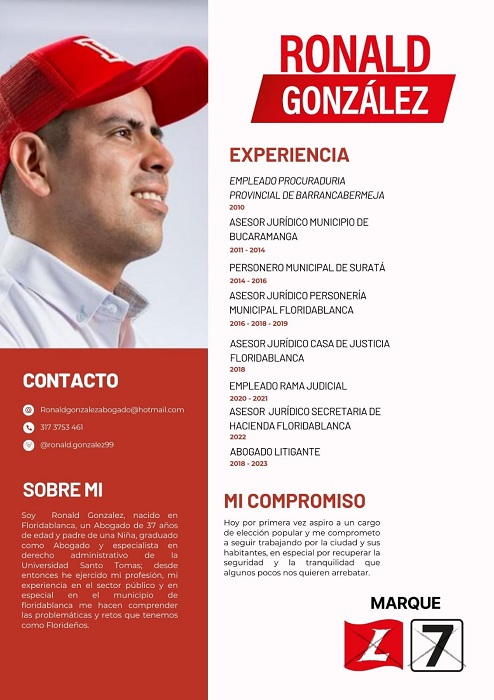 Acompañando a Sergio Flechas para la alcaldía, el abogado Ronald González aspira una curul en el concejo de Floridablanca, con el No 7, en la lista del partido Liberal.