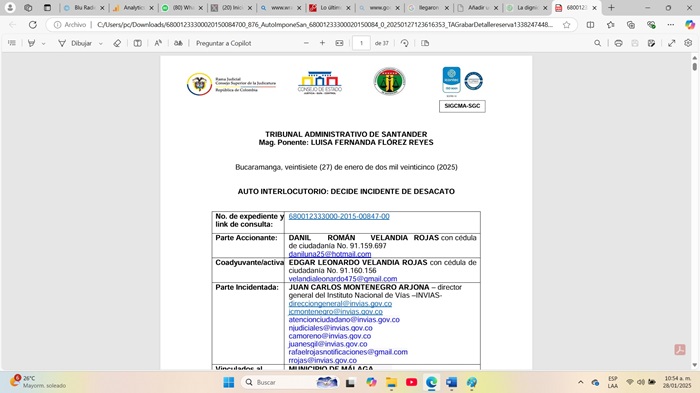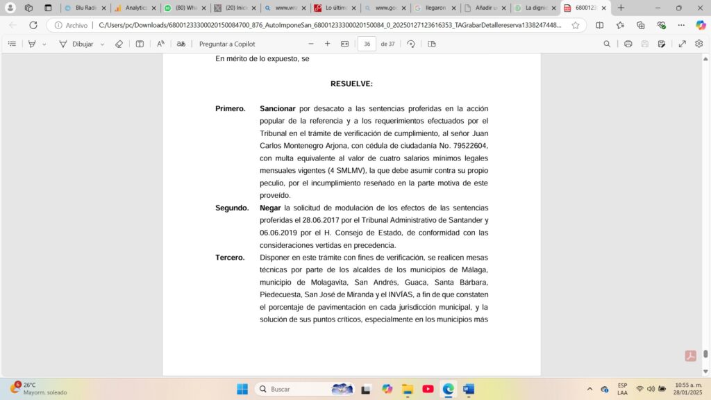 El Tribunal Administrativo de Santander, con ponencia de la magistrada Luisa Fernanda Flórez Reyes, sancionó al director nacional de Invias, Juan Carlos Montenegro Arjona, por incumplir una orden del Consejo de Estado relacionada con la pavimentación de la vía Curos-Málaga.