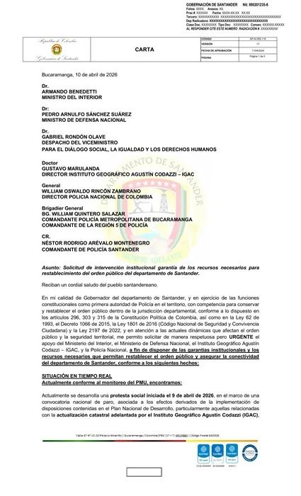 La comunicación, de 5 páginas, va dirigida al ministro del Interior, Armando Benedetti, el ministro de Defensa, Pedro Arnulfo Sánchez, al viceministro para el diálogo social, Gabriel Rondón Olave, al doctor Orlando Marulanda, director del IGAC y al general William Rincón, director de la Policía Nacional, entre otros.