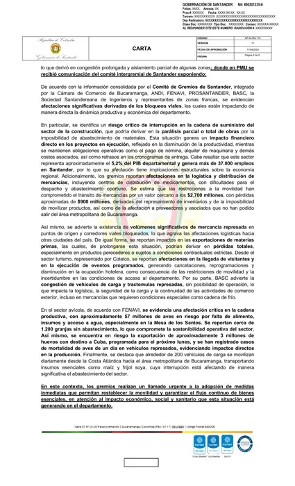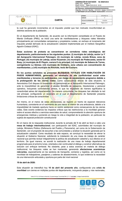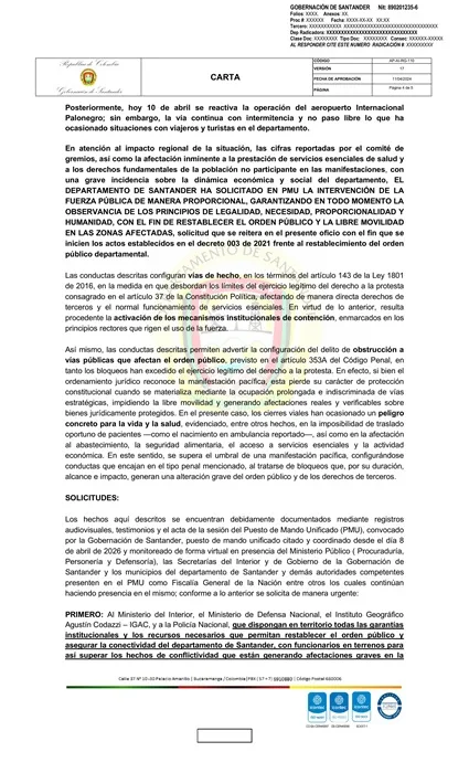 Expresamente, el mandatario departamental solicita a estos funcionarios y organismos, que dispongan en el territorio de departamento todas las garantías y recursos institucionales, de manera que se pueda restablecer el orden público y recuperar la conectividad de Santander con el resto de la geografía nacional.