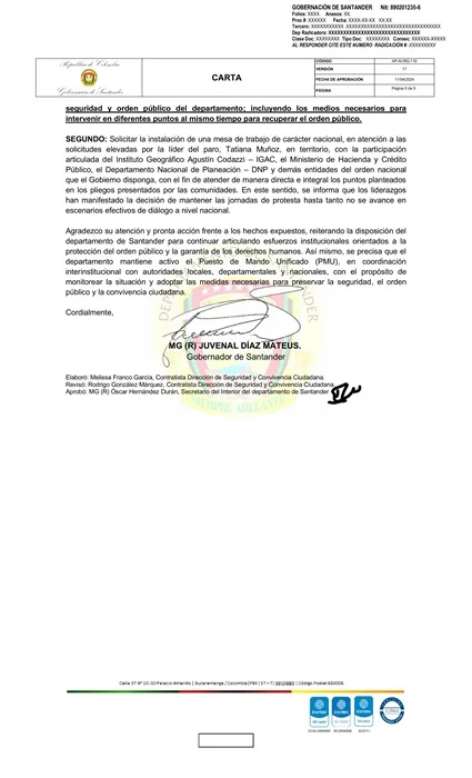 Ciudad Florida tuvo acceso a una extensa carta donde el gobernador, Juvenal Díaz Mateus, solicita al gobierno nacional, en cabeza del presidente Gustavo Petro, la intervención urgente e inmediata para poner fin al paro que tiene bloqueado al departamento de Santander.